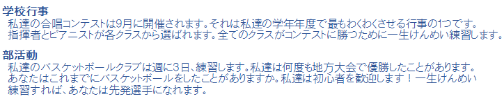 この講座では具体的にどんな力をめざすのか、その例をあげてみましょう。![]() 「ホームページで学校紹介」というテーマで、自分の学校の所在地、歴史、生徒と教員、学校行事、部活動についての英作文を課題にしています。この中の「学校行事の紹介」の例文訳として次のようなものがあります。 ![]() このような文章を英語でミスなくスムースに書ける力をめざします。 学習の範囲は基本的に教科書の内容に基づきますが、内容によって学期や学年の枠を超えて学習することもあります。 |